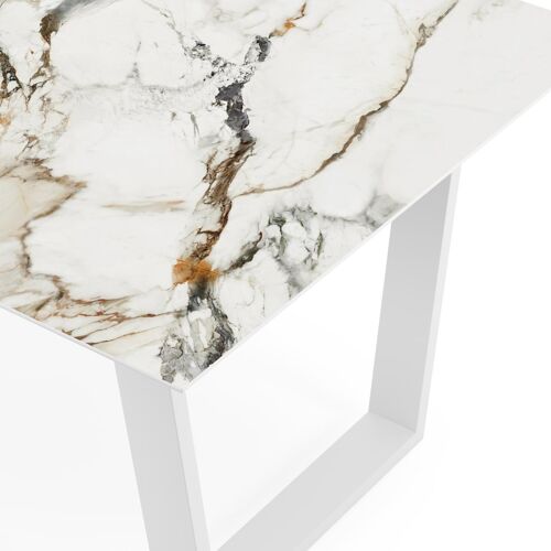Calacatta Luxe is een echte eyecatcher met luxueuze uitstraling. De basis van het blad is wit, maar toont intense contrasten en kleurschakeringen voor een verbluffend effect. Het is afgewerkt met grijze en goudgele aders voor een prachtige marmerlook.
