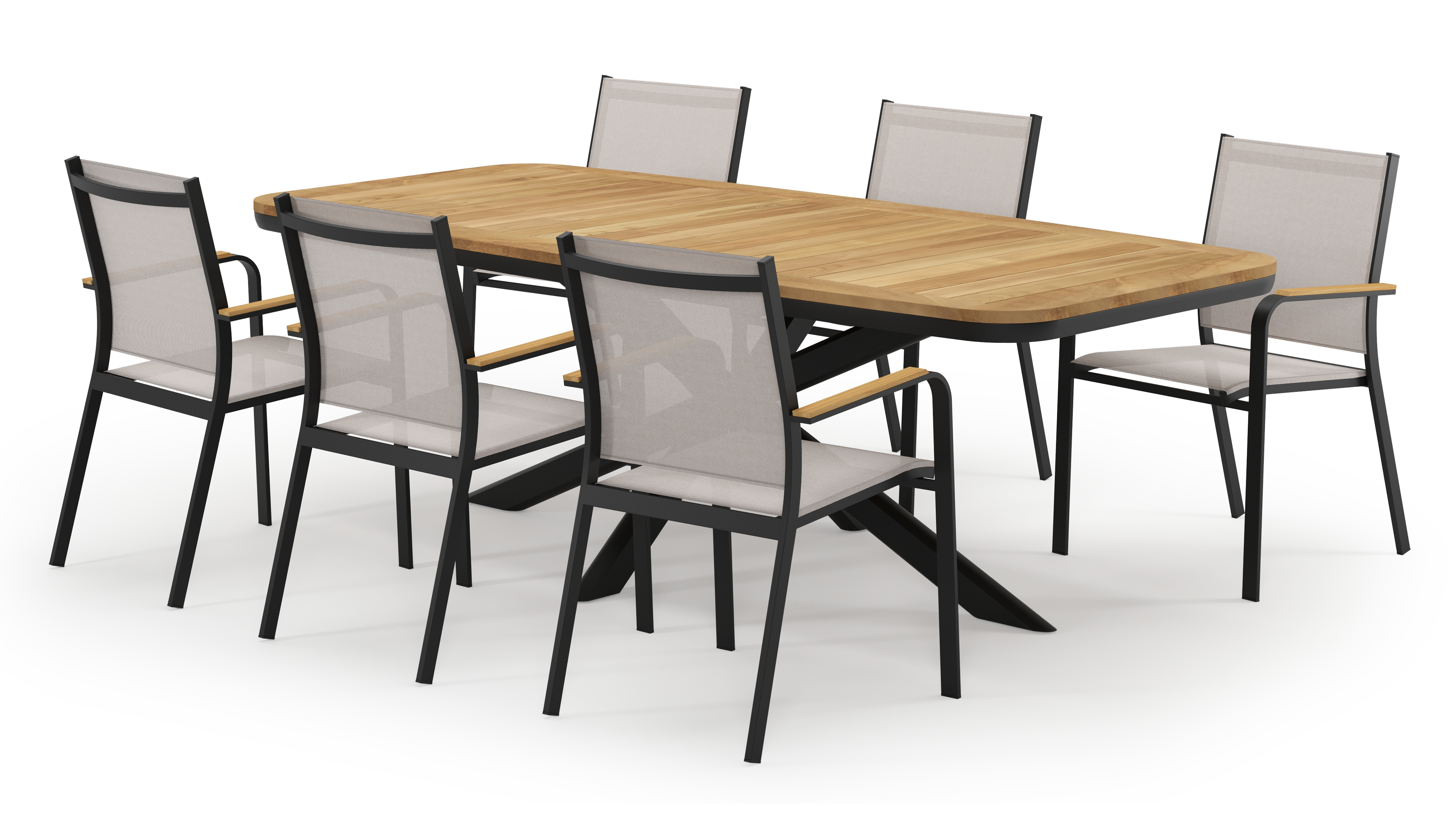 Pamplona bootvormige tuinset in zwart aluminium en teak natural finish met 6 Amalfi tuinstoelen | Exterioo tuinmeubelen