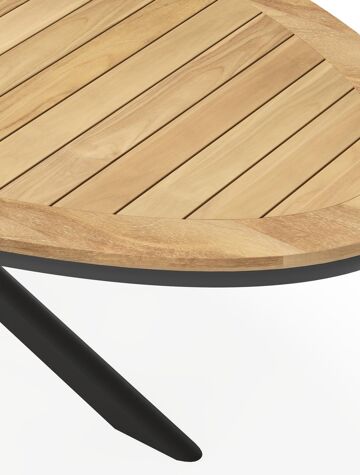 Een tafelblad uit teak staat gelijk aan bijzondere kwaliteit en natuurlijk design. Teak is een kwalitatieve houtsoort gekenmerkt door zijn hardheid. Aangezien hout leeft, kan de structuur of kleur licht anders zijn dan op het beeld weergegeven.
