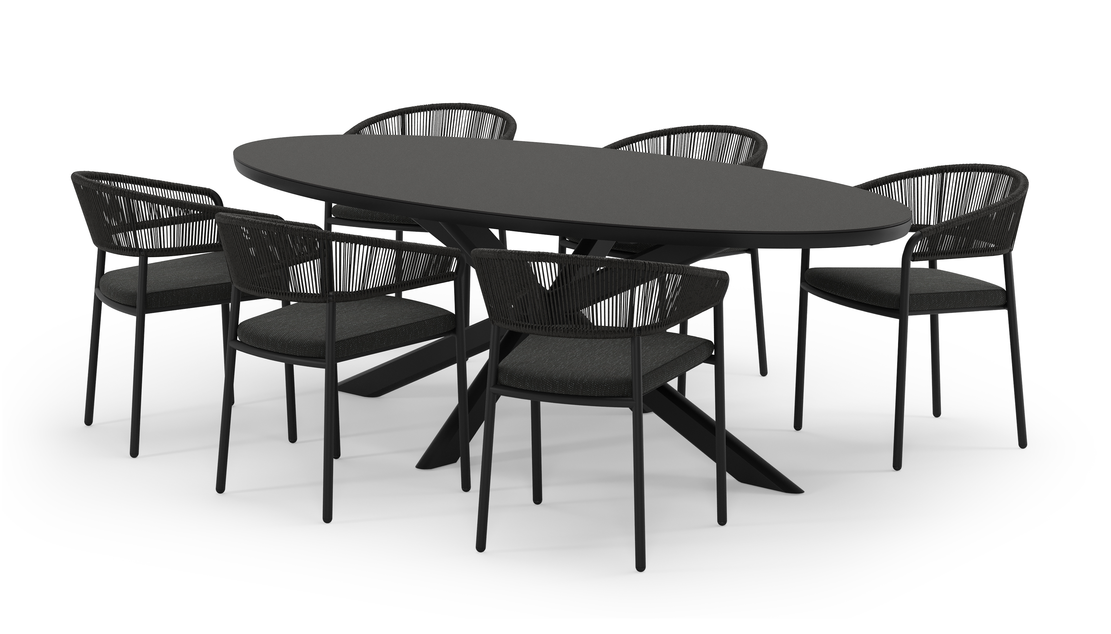 De Pamplona tuinset straalt met zijn afgeronde vorm en opvallende kruispoot een robuuste hedendaagse look uit. Deze tuinset is ideaal voor een groot gezelschap.