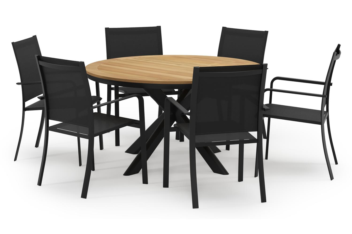 Pamplona ronde tuinset in zwart aluminium en teak naturel met 6 Calobra tuinstoelen | Exterioo