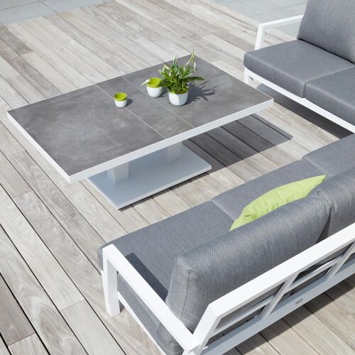 De Pop-up loungetafel is een mooie uitbreiding van jouw loungeset. Vervolledig jouw terras met deze mooi afgewerkt loungetafel. Genoeg plaats om jouw spullen op te plaatsen! Het frame van de loungetafel is gemaakt uit roestvrij aluminium, een sterk, maar toch licht materiaal dat makkelijk verplaatsbaar is. Het oppervlak is glad afgewerkt waardoor het geen vuil aantrekt en onderhoudsvriendelijk is. De poedercoating zorgt voor de UV- en weersbestendigheid van je meubel. Een volkeramisch tafelblad is een keramische plaat die op extreem hoge temperatuur gebakken wordt. Het materiaal is uiterst stevig en kan tegen een stootje. Een volkeramisch tafelblad is vorst-, hitte- en krasbestendig en eenvoudig schoon te maken.