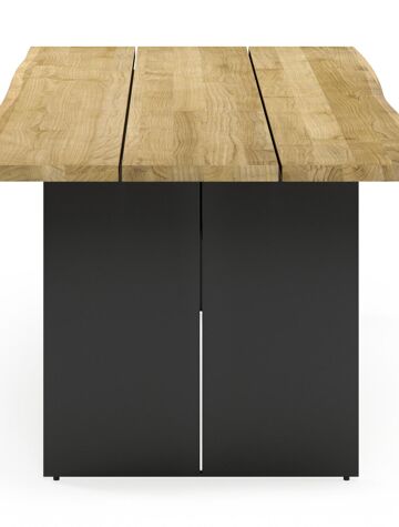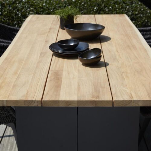 De Portofino tafel heeft een uniek onderstel bestaande uit 2 strakke panelen verbonden door een verstevigingsbar. De Portofino tafel is perfect geschikt voor wie houdt van strak en modern, maar tegelijk ook de natuurlijke materialen apprecieert.Deze tafel is afgewerkt met een tafelblad in Live edge teak. Live edge bladen bestaan uit planken van teak-hout die komen uit de harde kern van de boom, aangevuld met een zachtere zijkant dat komt van het uiteinde van de stam. De vorm van de rand volgt dus de vorm van de boom. De schors wordt verwijderd en de zijkant wordt opgeschuurd. Hierdoor krijg je dus een grillige vorm, die bij elke blad uniek van vorm is.