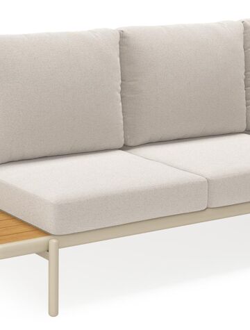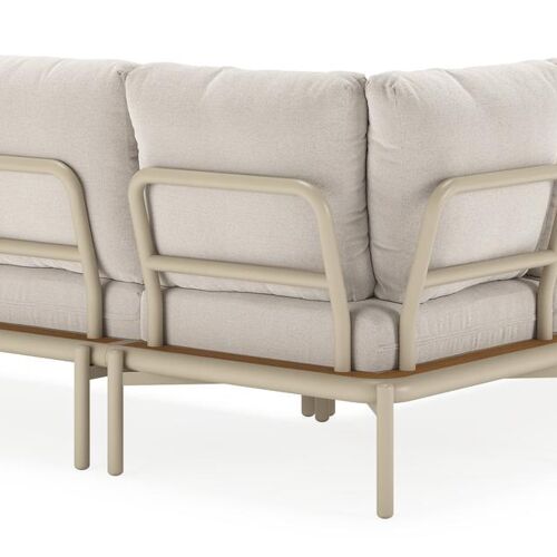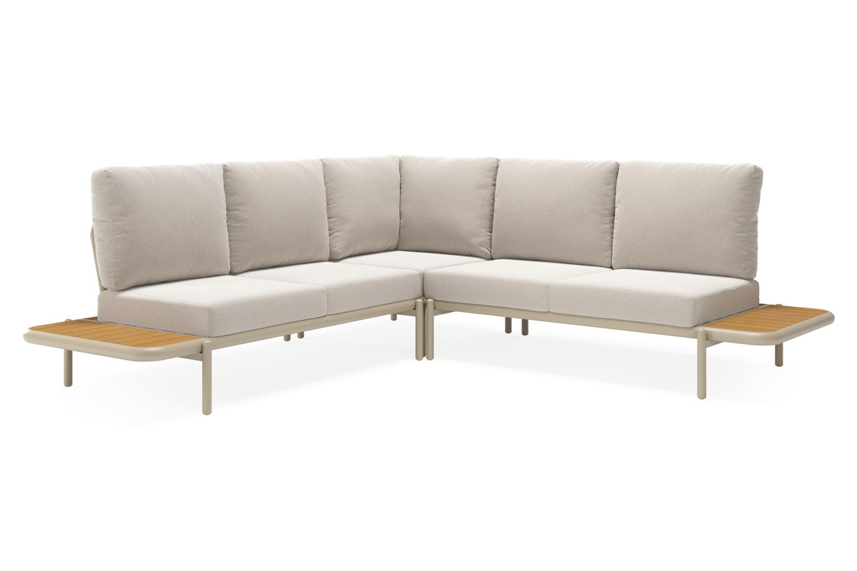 Ervaar ultiem comfort en moderne elegantie met deze stijlvolle Pulo lounge. Het frame van gepoedercoat aluminium met afgeronde vormen en slanke, ronde poten geeft de lounge een luchtige en verfijnde uitstraling. De ingebouwde zijtafels, vervaardigd uit polywood, voegen een warme, natuurlijke toets toe en bieden een handige plek om je drankje binnen handbereik te houden. De loungekussens zijn inbegrepen en gemaakt uit Weather+ Softtouch. Deze kussens hebben een olefin stof waardoor ze zacht aanvoelen en vuilafstotend zijn. Weather+ Softtouch kussens zijn beperkt waterafstotend en hebben één laag standaard schuimkussen in een waterbestendige binnenhoes. In de winter of bij langdurige regen bewaar je de kussens best binnen.