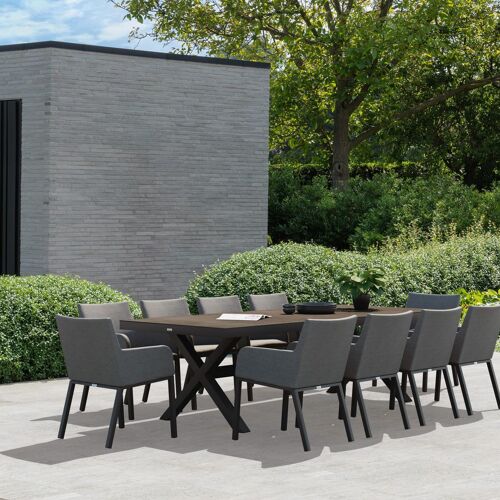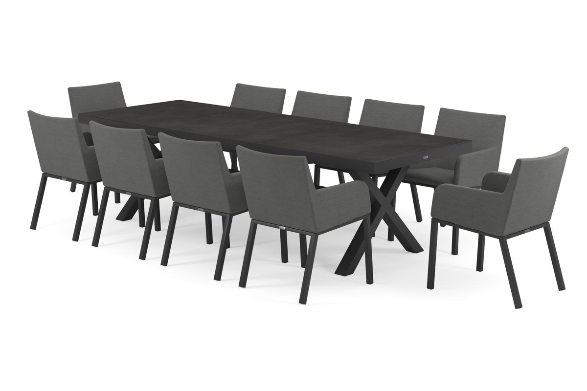 Reza tuinset in zwart aluminium en zwart volkeramiek tafelblad met 10 Rivo tuinstoelen | Exterioo
