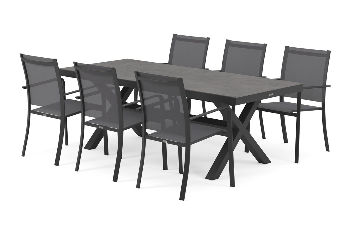 Reza tuinset heeft een uitzonderlijke kruispoot en een stevig, dik frame waarin het tafelblad geplaatst is. In het midden van de tafel loopt een balk als extra ondersteuning van het frame.