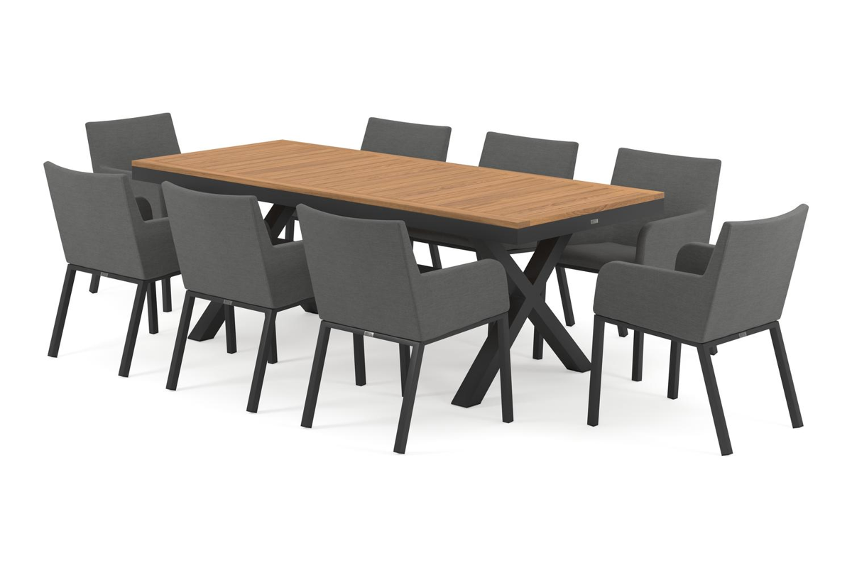Reza tuinset heeft een uitzonderlijke kruispoot en een stevig, dik frame waarin het tafelblad geplaatst is. In het midden van de tafel loopt een balk als extra ondersteuning van het frame.