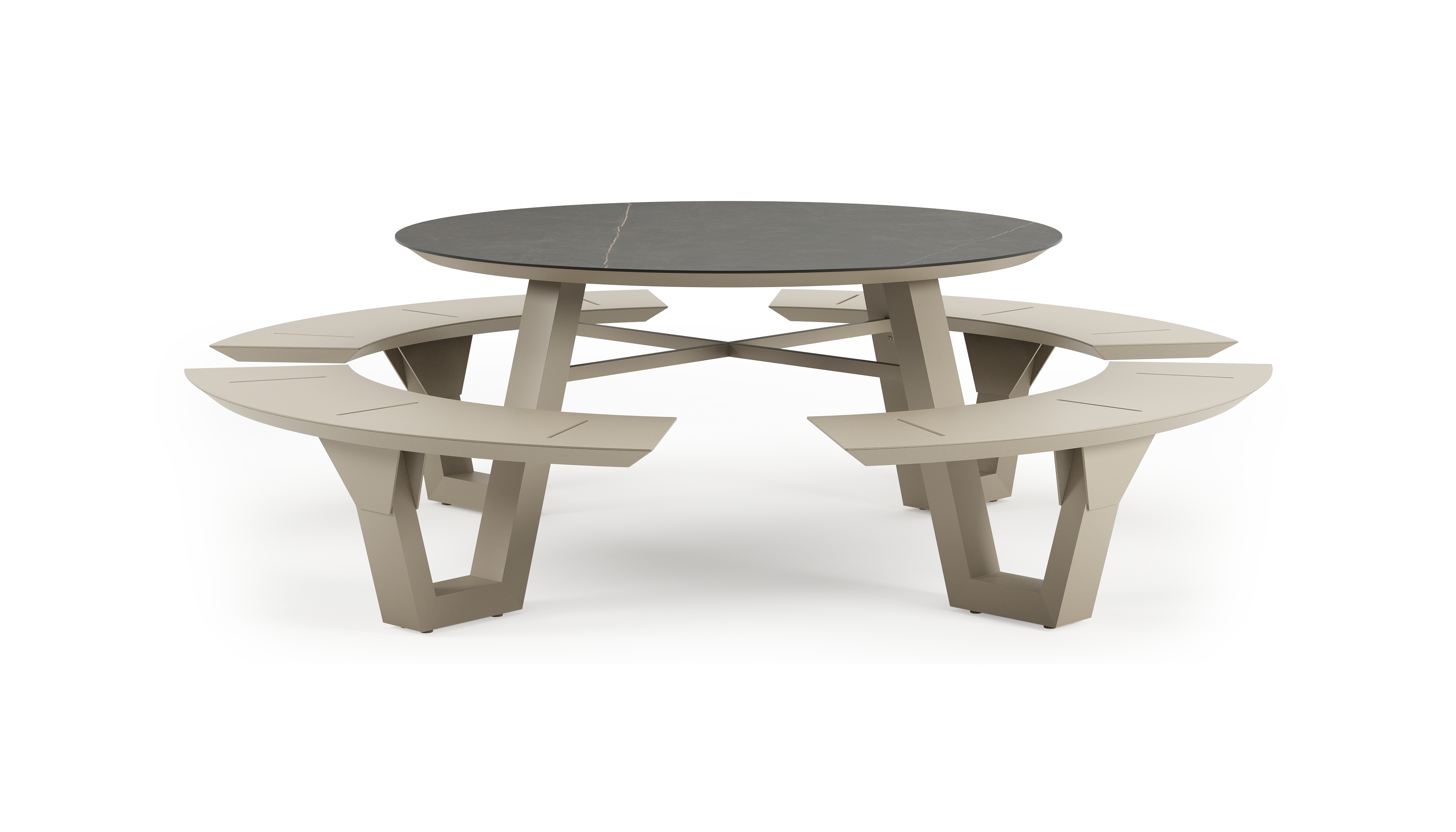 Rondino picknicktafel rond in beige aluminium en volkeramiek Calatorao - Dia. 148 x H 71.5 cm | Exterioo tuinmeubelen