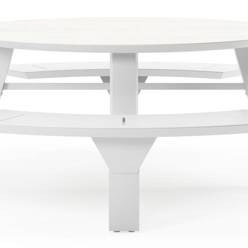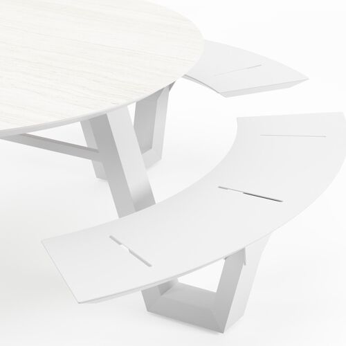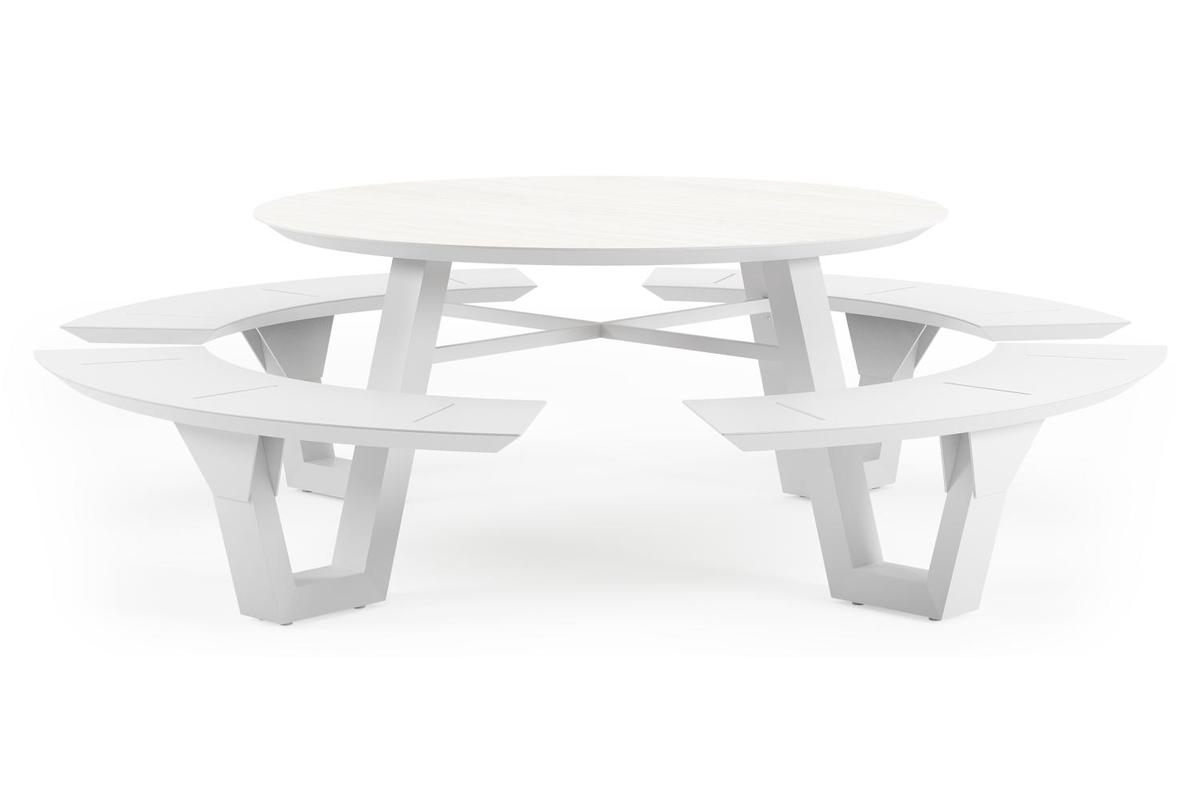 De Rondino picknicktafel omarmt een minimalistisch design met een robuuste look. De langwerpige banken sluiten naadloos aan op het frame van de tafel, waardoor een gestroomlijnde en samenhangende look ontstaat. De ronde vorm zorgt ervoor dat je gezellig met meerdere mensen bij elkaar kan zitten.