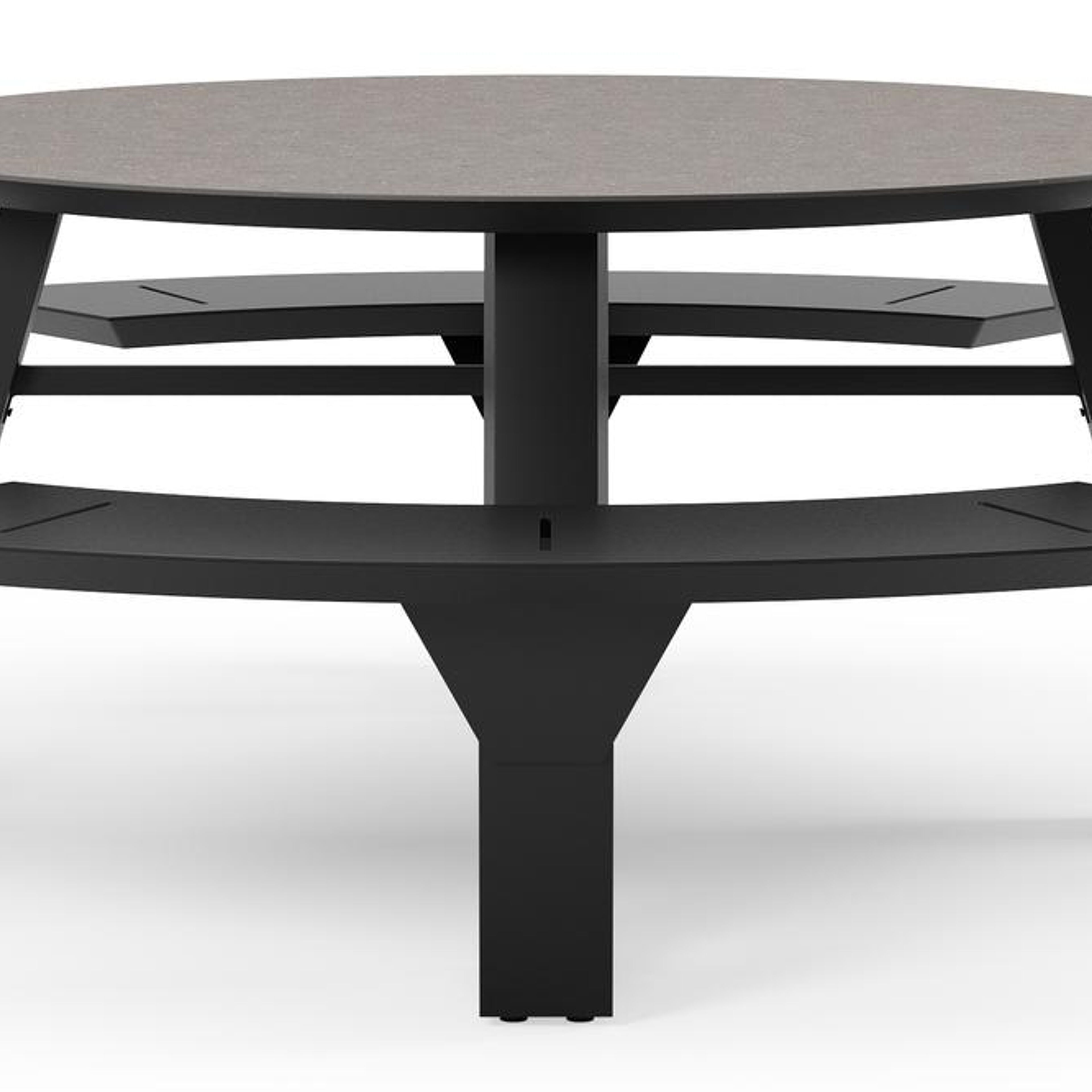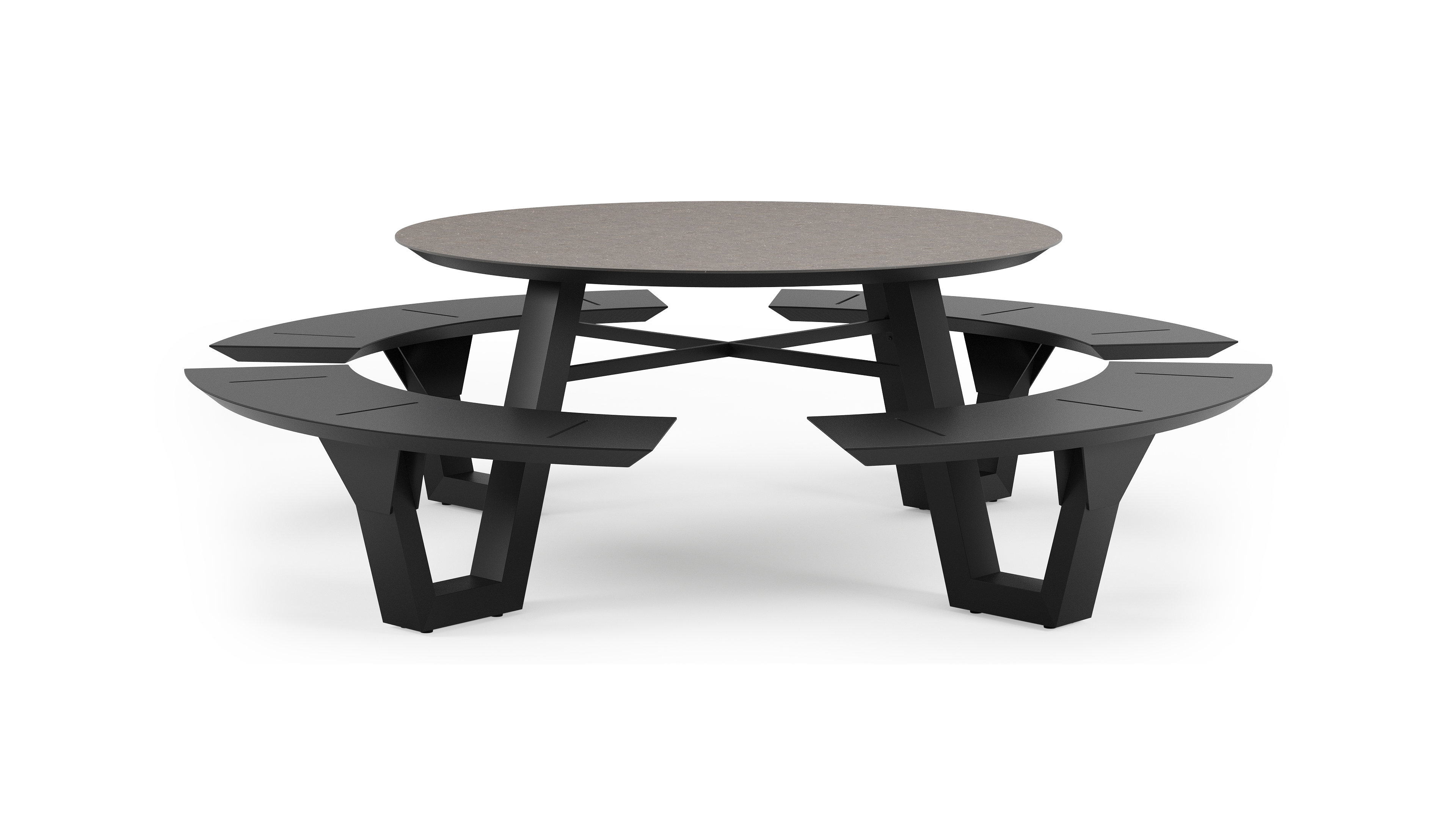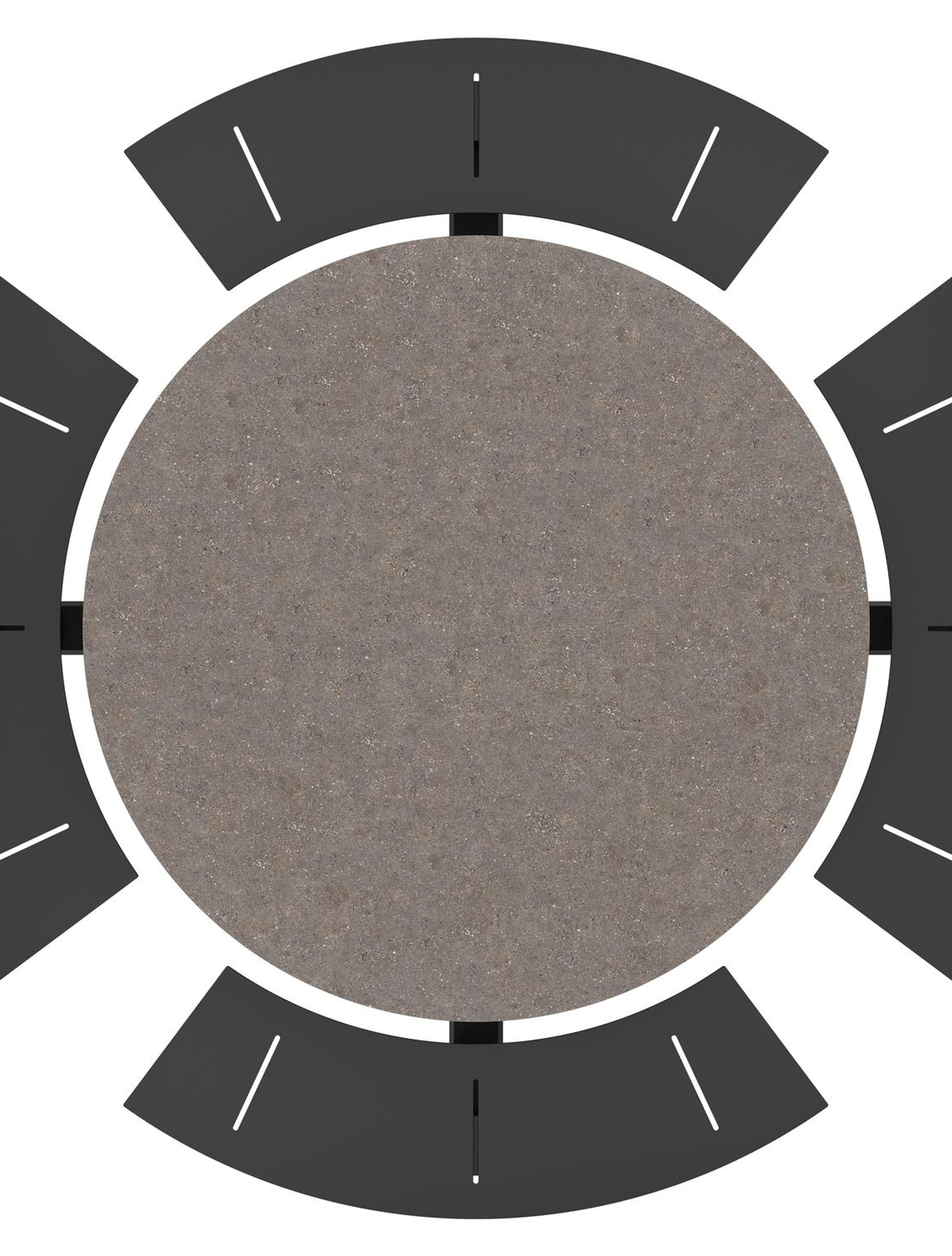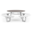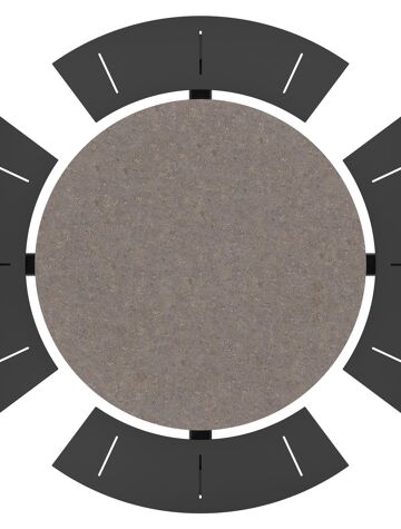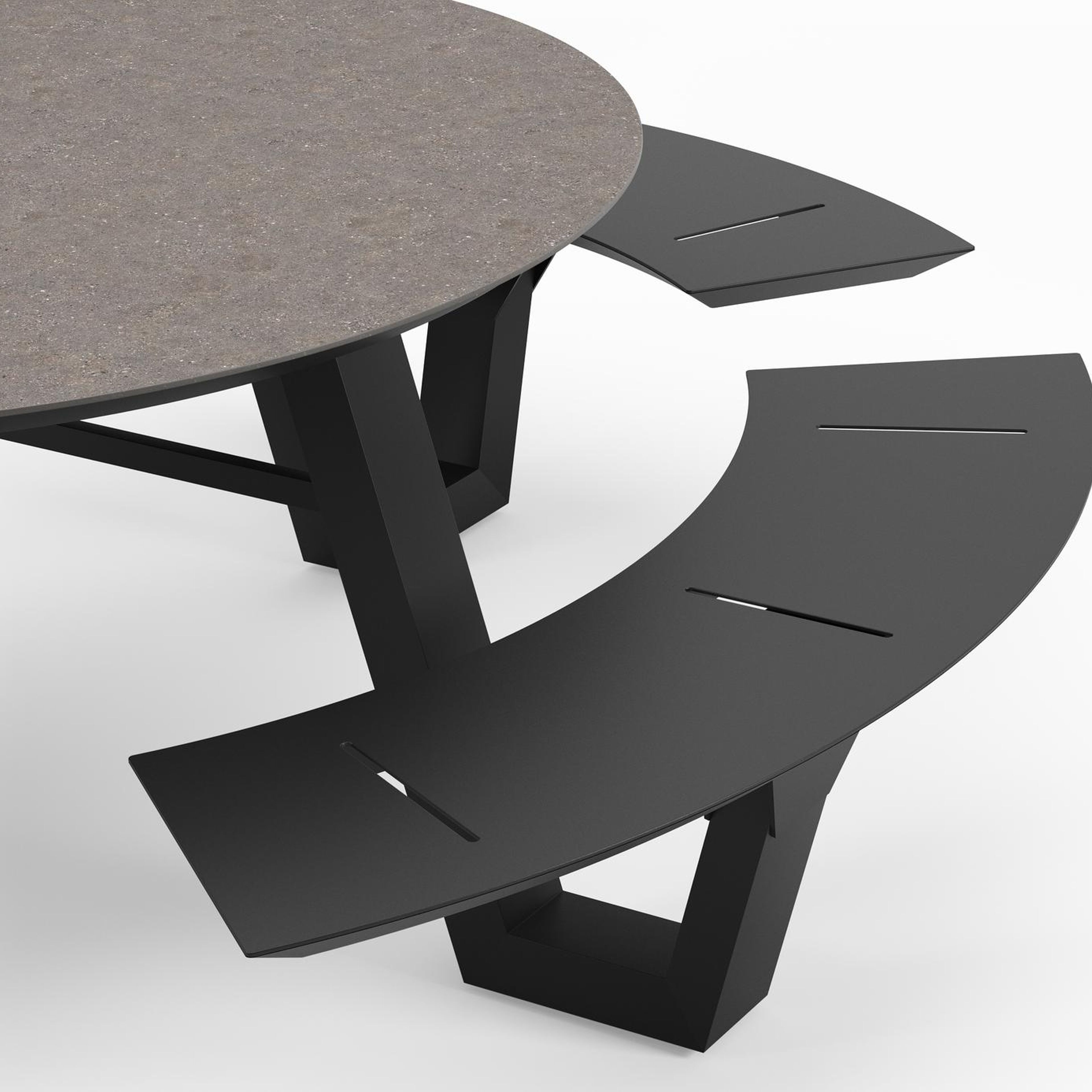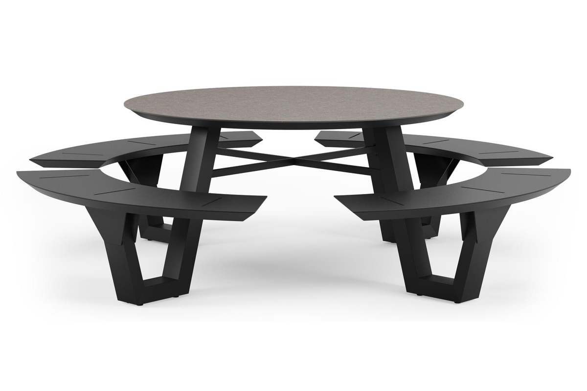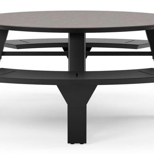 De Rondino picknicktafel omarmt een minimalistisch design met een robuuste look. De langwerpige banken sluiten naadloos aan op het frame van de tafel, waardoor een gestroomlijnde en samenhangende look ontstaat. De ronde vorm zorgt ervoor dat je gezellig met meerdere mensen bij elkaar kan zitten.