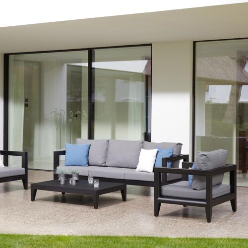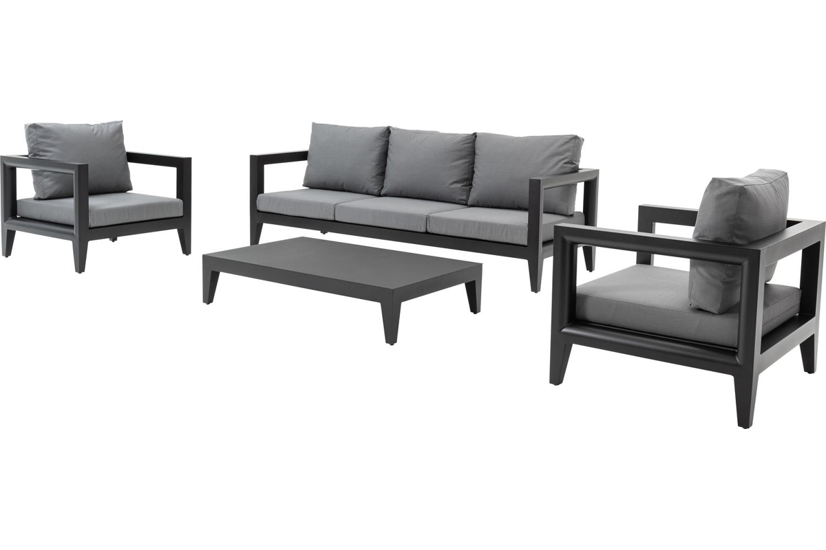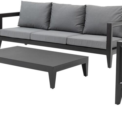 Complete loungeset met frame in aluminium (zwart) en zit- en rugkussens in Weather+ Textilene (grijs). De loungeset bestaat uit 1x 3-zit (B 218 x D 79 x H 64 cm), 2x 1-zit (B 86 x D 79 x H 64 cm), loungetafel (L 120 x B 78 cm) en zit- en rugkussens. Er is plaats voor 5 personen.