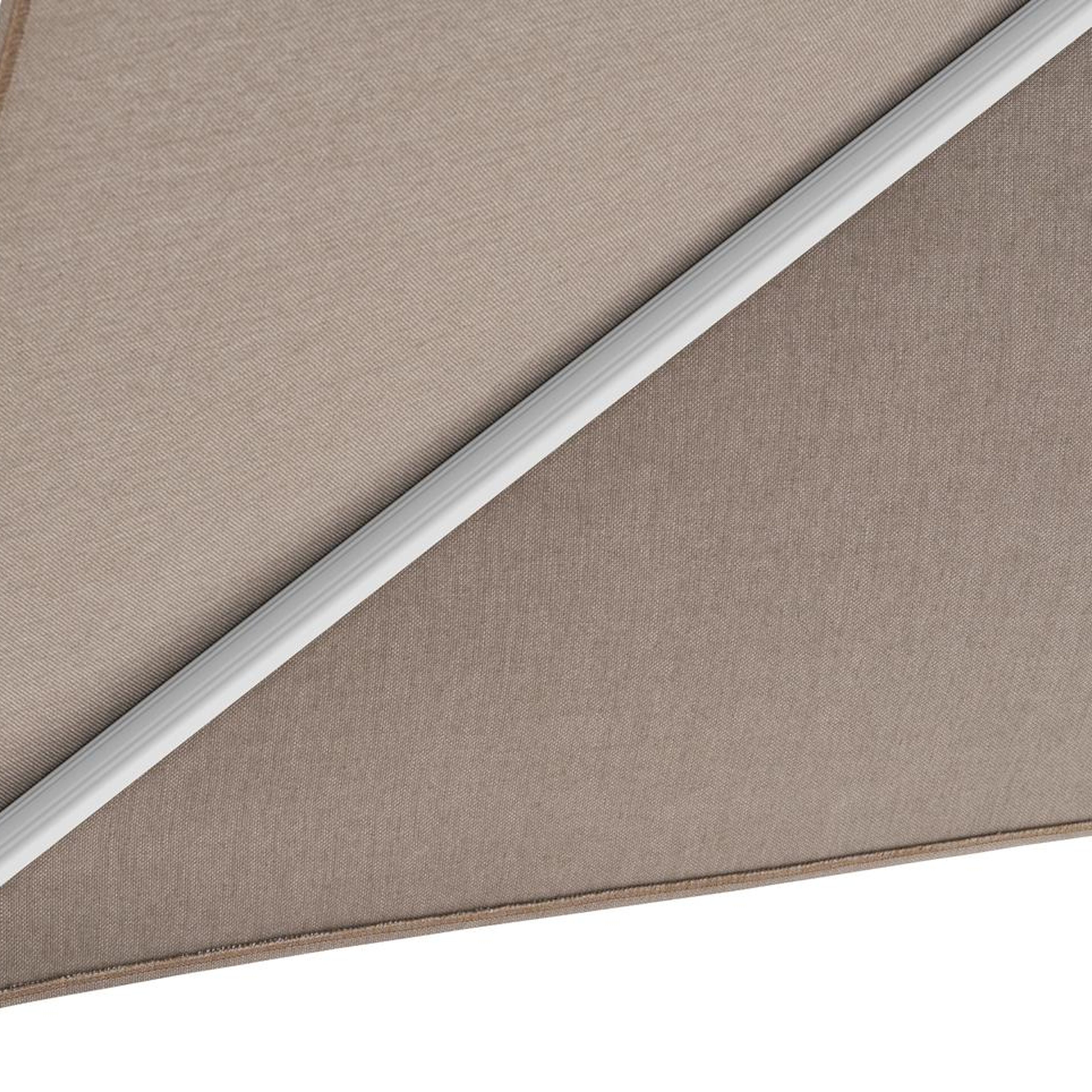 Het frame van de parasol is gemaakt uit roestvrij aluminium. Dit sterke en onderhoudsvriendelijke materiaal zorgt voor een stevige constructie en een moderne uitstraling.