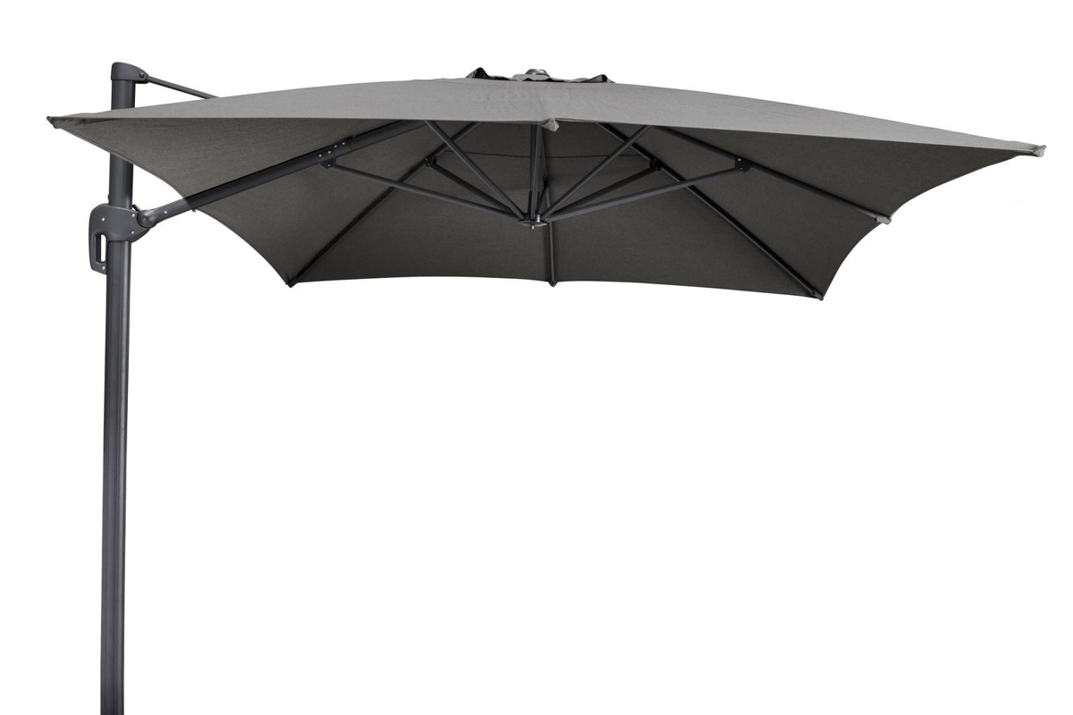 Luxe zweefparasol met mast en baleinen in zwart gepoederlakt aluminium. Het doek is gemaakt in Sunbrella stof in All Weather kwaliteit met windvang. Kleur: Natte Nature Grey. Zeer eenvoudig te openen dankzij de zwengel. De parasol is verstelbaar in verschillende standen en zeer compact inklapbaar met de handgreep. Draaibaar 360° rond zijn as. Inclusief kruisvoet (tegels of parasolvoet apart verkrijgbaar). Met beveiligingssysteem. Afmetingen doek: L 3 x B 4 m. Inclusief beschermhoes. Voor de parasolvoet raden we aan een minimumgewicht van 120kg te respecteren.