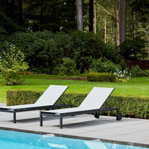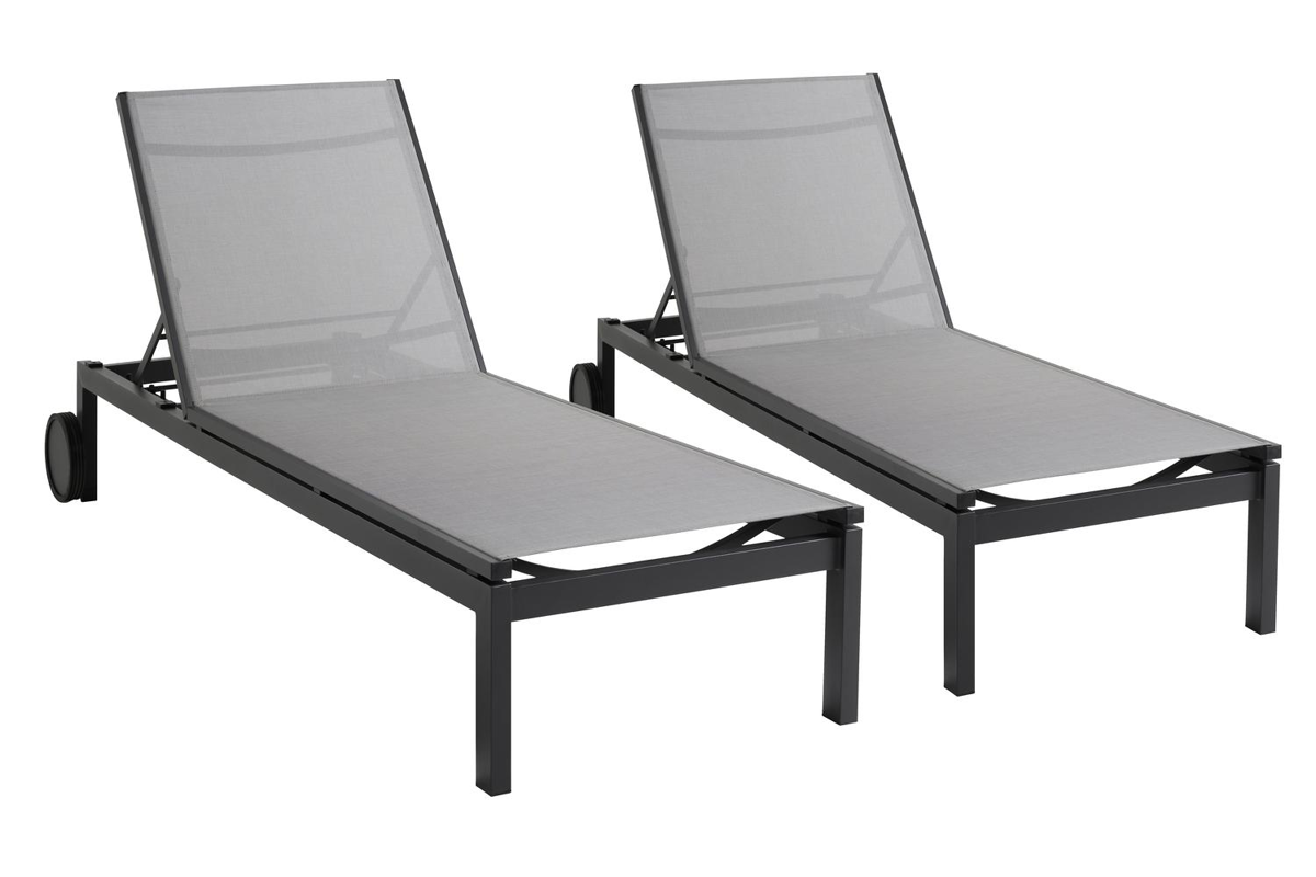 De set van 2 verstelbare Caravelle ligbedden is een strak en robuust ligbed door de look van het frame. De rugleuning is verstelbaar in 5 standen. Je kan het ligbed ook makkelijk verplaatsen dankzij de grote wielen achteraan.