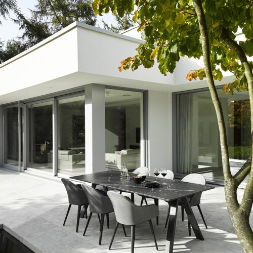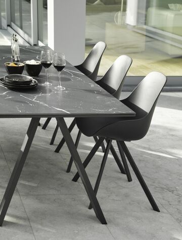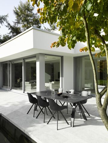 Volkeramisch tafelblad. Dikte: 6 mm. Glasvezel versterking onderaan. Kleur: NERO MARQUINA Eigenschappen: Krasbestendig - watervast - bestand tegen regen en vriestemperaturen - Uv bestendig - geschikt voor intens gebruik en eenvoudig te reinigen. Gemaakt van 100% natuurlijk materialen. 240 x 100 cm.
