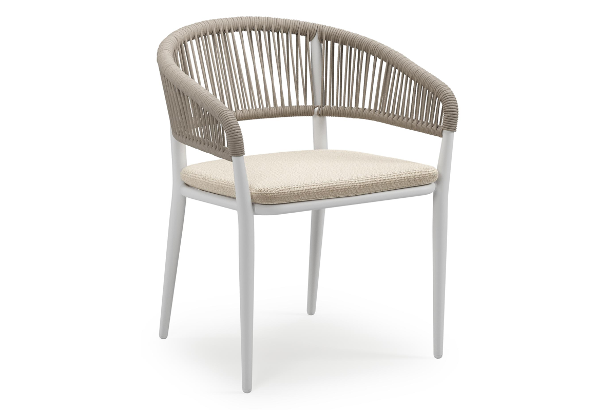 Tolfa stapelbare tuinstoel in wit aluminium en beige verticaal geweven ronde rope met stoelkussen in All Weather Cosytica Althea Chalk | Exterioo
