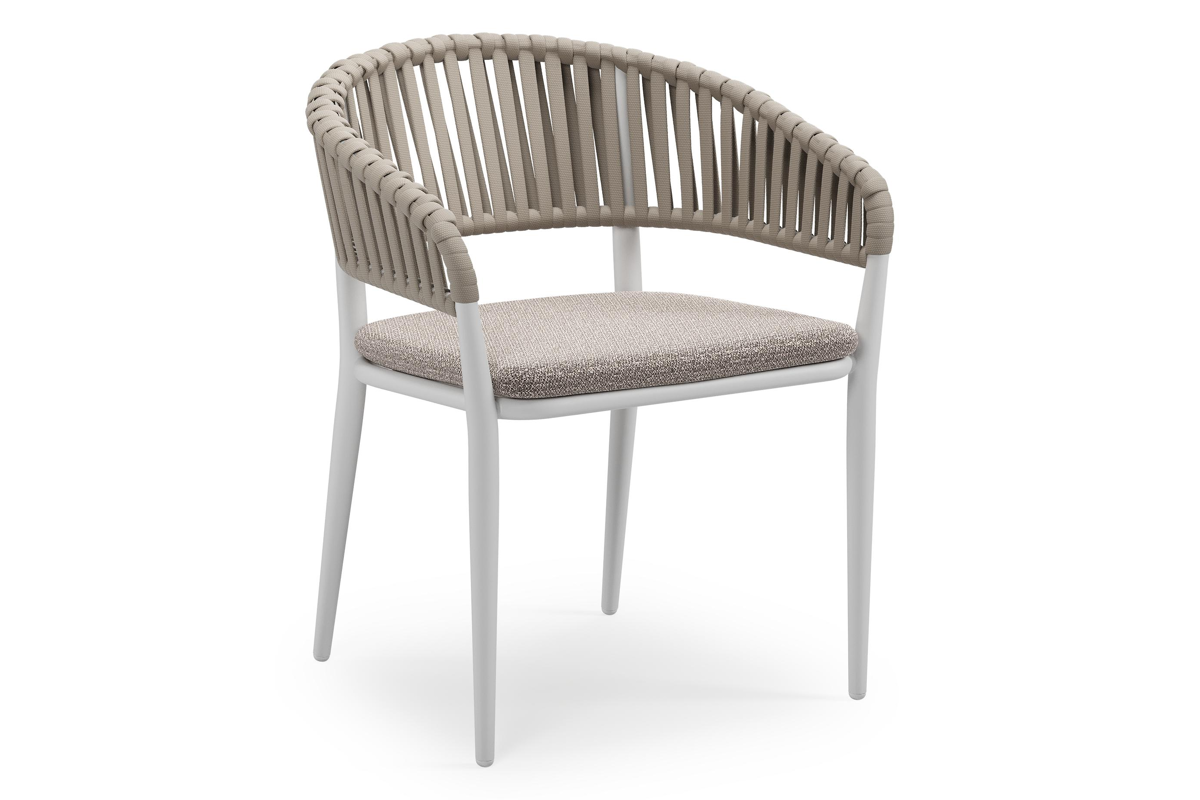 Tolfa stapelbare tuinstoel in wit aluminium en beige verticaal geweven luxe vlakke brede rope met stoelkussen in All Weather Sunbrella® Luxe Wander Granite | Exterioo