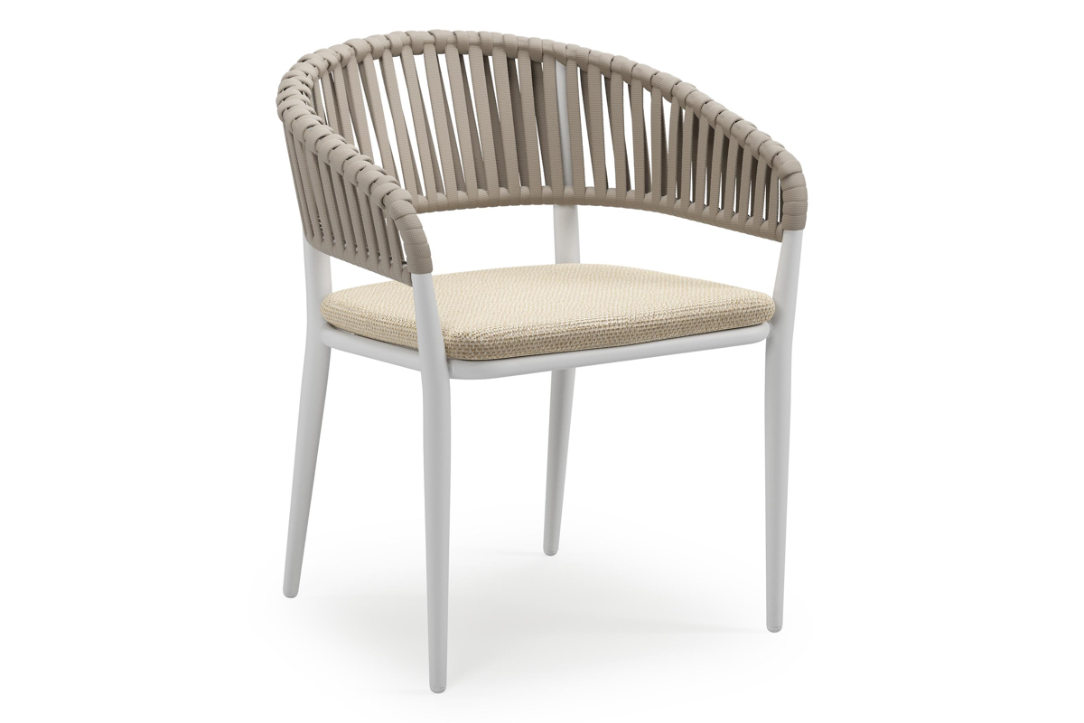 Tolfa stapelbare tuinstoel in wit aluminium en beige verticaal geweven luxe vlakke brede rope met stoelkussen in All Weather Cosytica Althea Camel | Exterioo