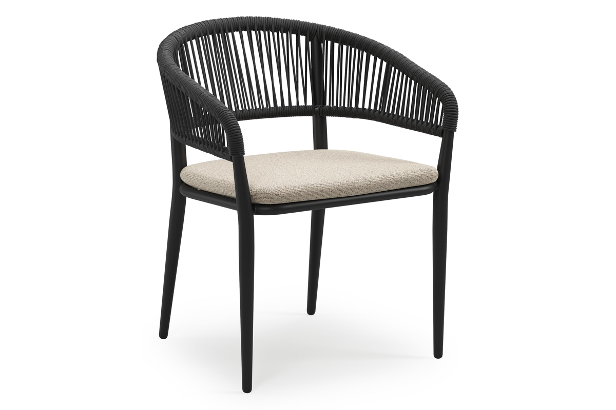 Tolfa stapelbare tuinstoel in zwart aluminium en zwart verticaal geweven ronde rope met stoelkussen in All Weather Cosytica Marbella Beige | Exterioo
