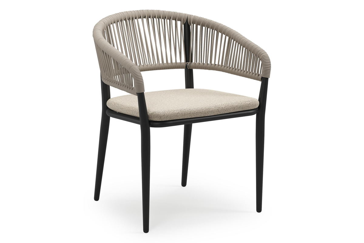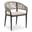 Tolfa stapelbare tuinstoel in zwart aluminium en beige verticaal geweven ronde rope met stoelkussen in All Weather Cosytica Marbella Beige | Exterioo