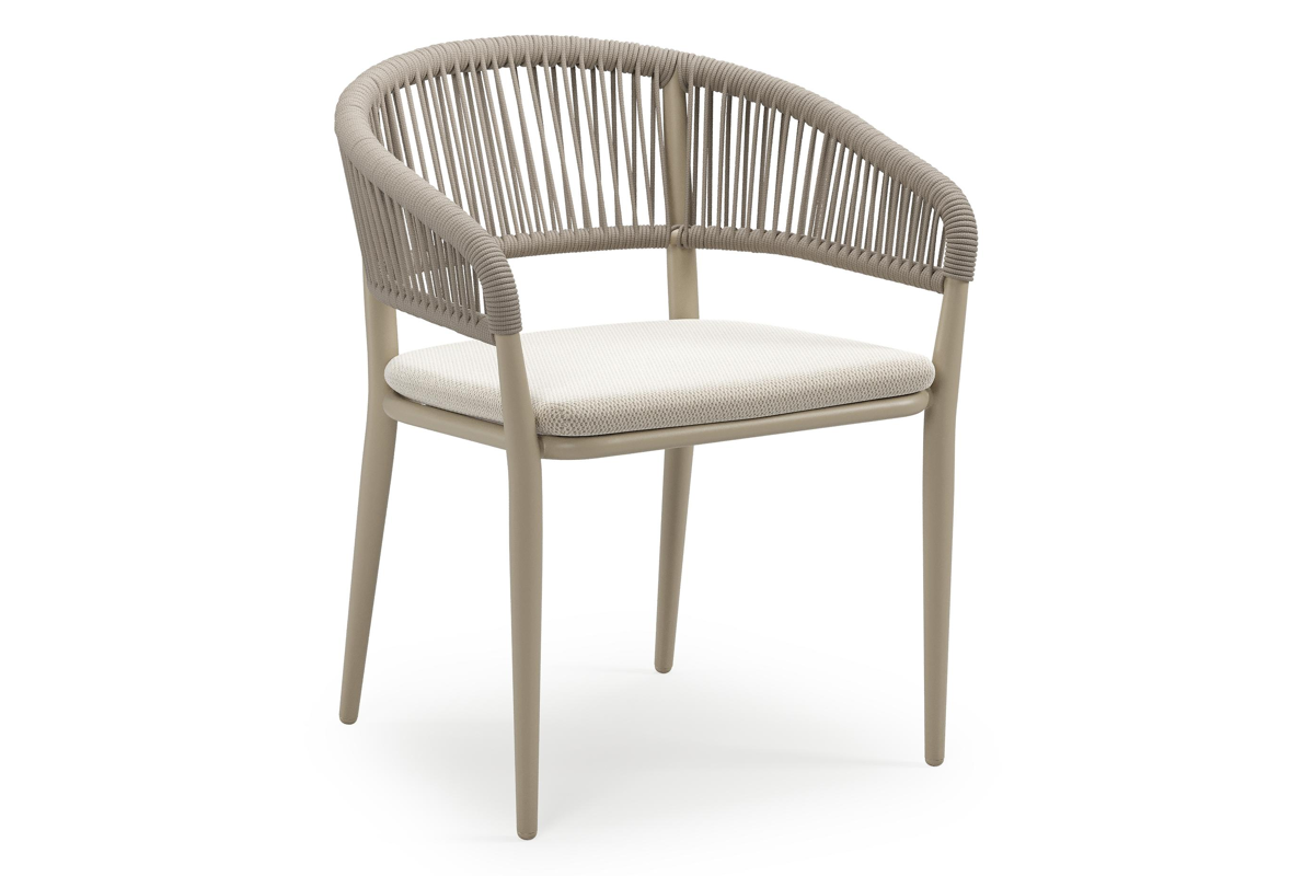 Tolfa stapelbare tuinstoel in beige aluminium en beige verticaal geweven ronde rope met stoelkussen in All Weather Sunbrella® Luxe Lopi Marble | Exterioo