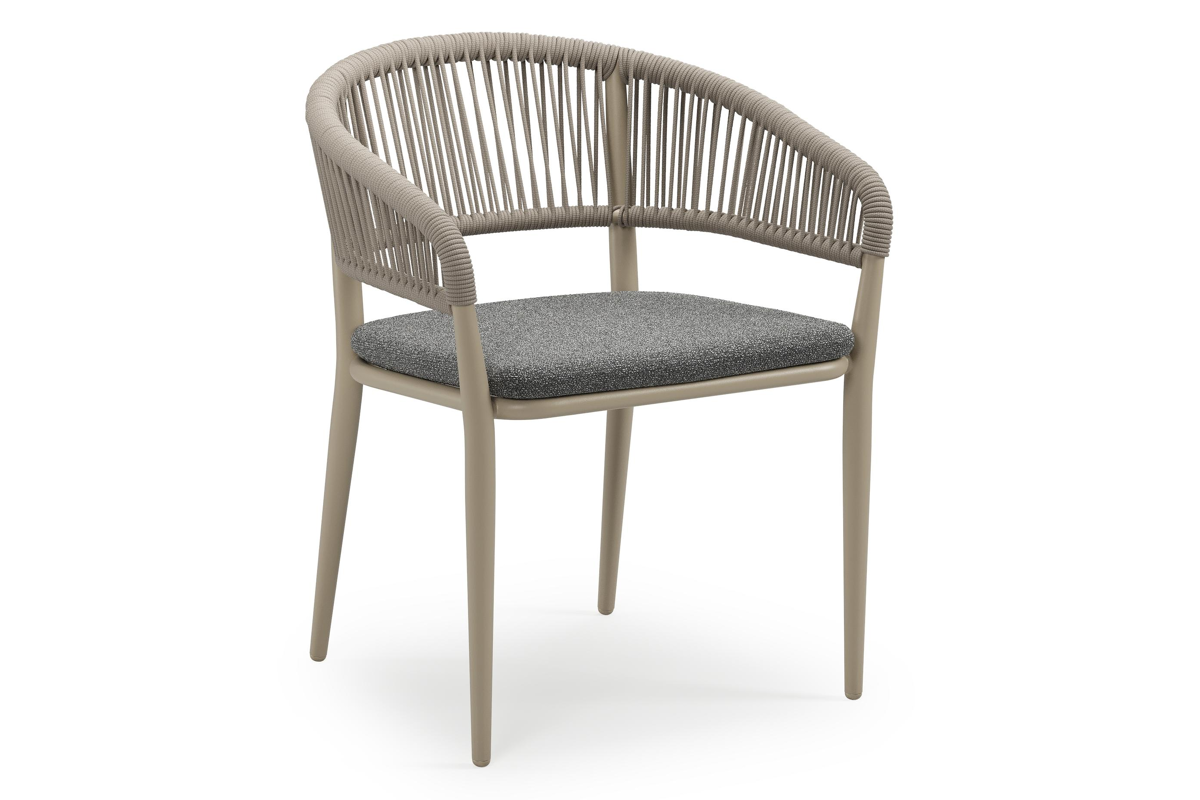 Tolfa stapelbare tuinstoel in beige aluminium en beige verticaal geweven ronde rope met stoelkussen in All Weather Cosytica Catania Black | Exterioo