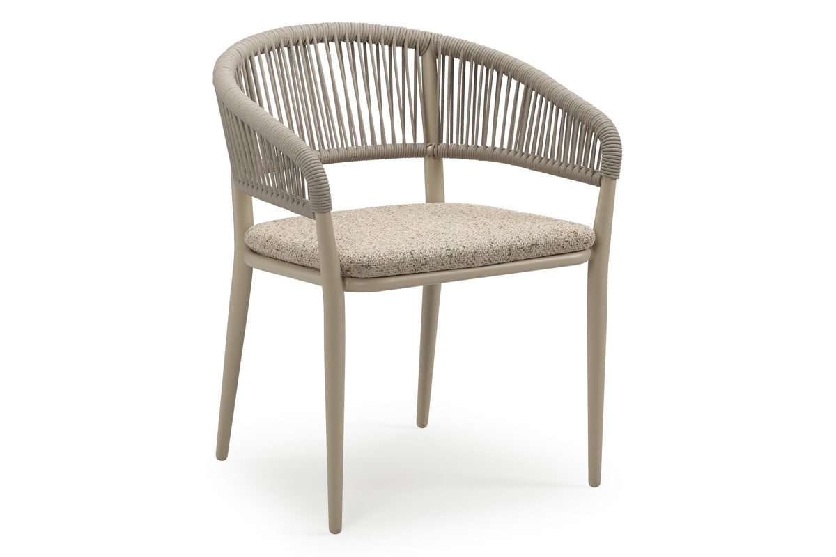 Tolfa stapelbare tuinstoel in beige aluminium en beige verticaal geweven ronde rope met stoelkussen in All Weather Cosytica Bora Jungle | Exterioo