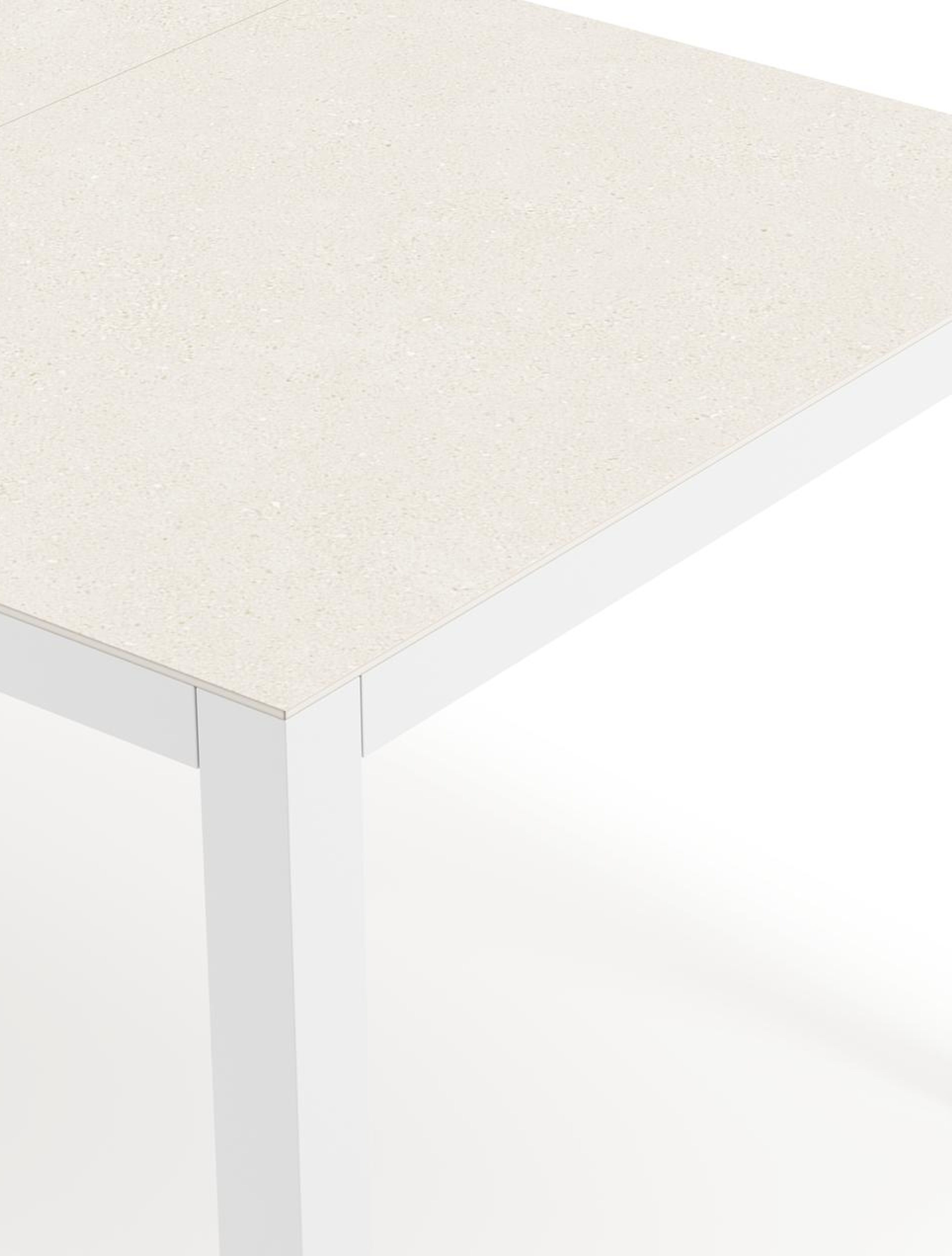 Een Sintered stone tafelblad bevat verschillende soorten mineralen die op een nog hogere druk worden gebakken dan keramiek, maar toch dezelfde eigenschappen heeft. Het materiaal is uiterst stevig. Het is vorst-, hitte- en krasbestendig en eenvoudig schoon te maken. Het tafelblad is gemaakt uit verschillende stukken.