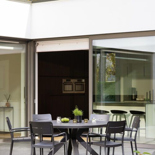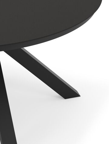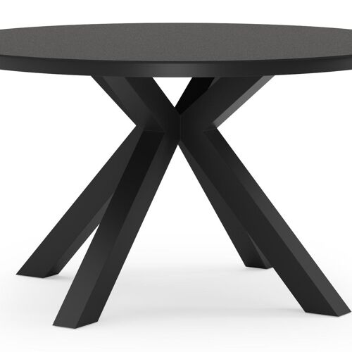 De Tora tuintafel is een collectie met ronde tafels. De kenmerkende kruispoot splitst zich onder het frame uit in vier gespreide poten, wat zorgt voor extra stabiliteit.