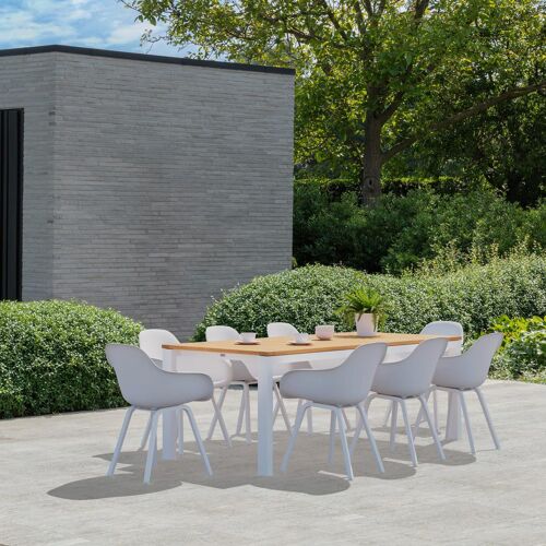Trente tuinset heeft een stijvol design met een frame dat je tafelblad als het ware laat zweven. Dankzij de diepere ligging van de poten kan je op de kopse kant telkens nog een stoel plaatsen. De stevige tafelpoten maken deze tafel af.