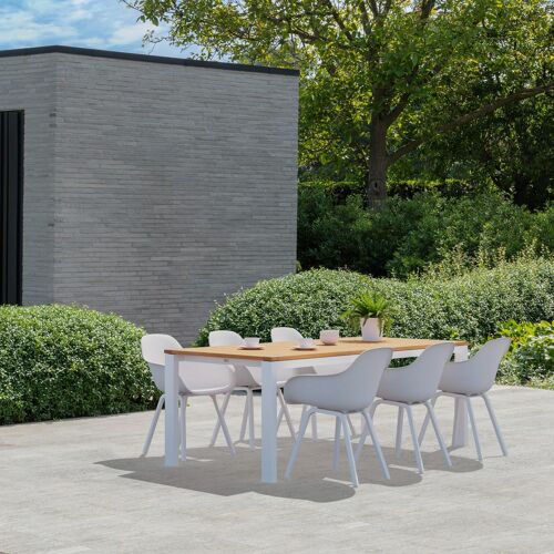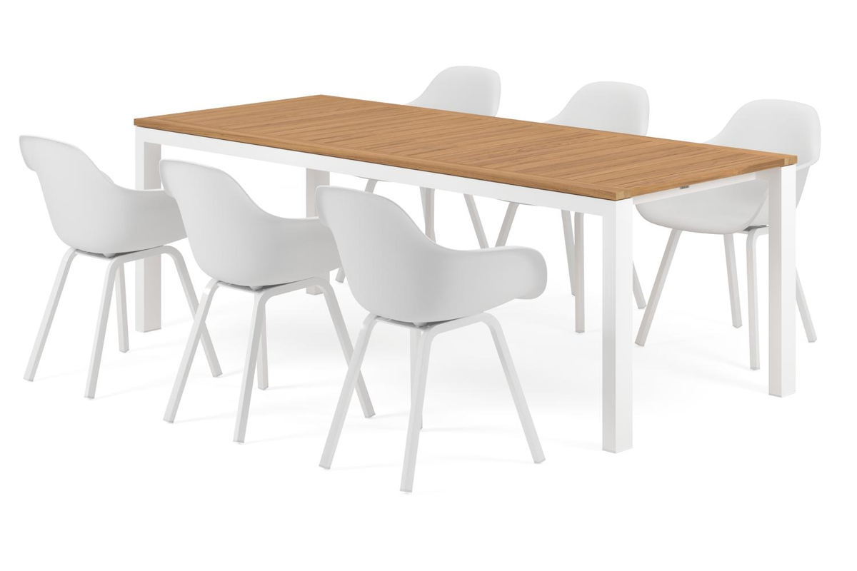 Trente tuinset heeft een stijvol design met een frame dat je tafelblad als het ware laat zweven. Dankzij de diepere ligging van de poten kan je op de kopse kant telkens nog een stoel plaatsen. De stevige tafelpoten maken deze tafel af.