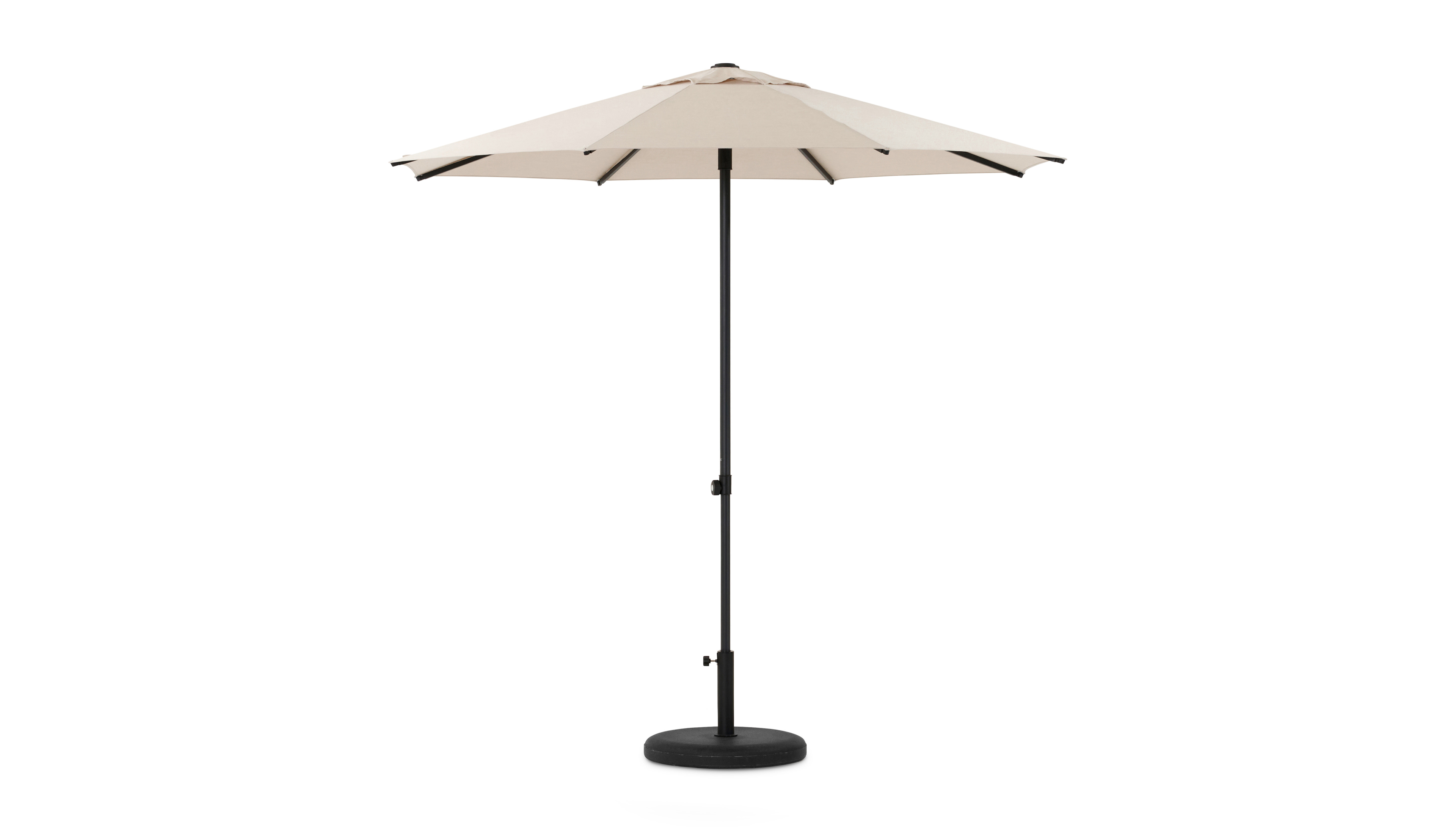 De Umbria parasol is een ronde staanparasol die je eenvoudig kan openen en sluiten via het knopmechanisme. De parasol is ideaal om ook op een klein balkon of terras te gebruiken. De parasolvoet uit beton is inclusief.