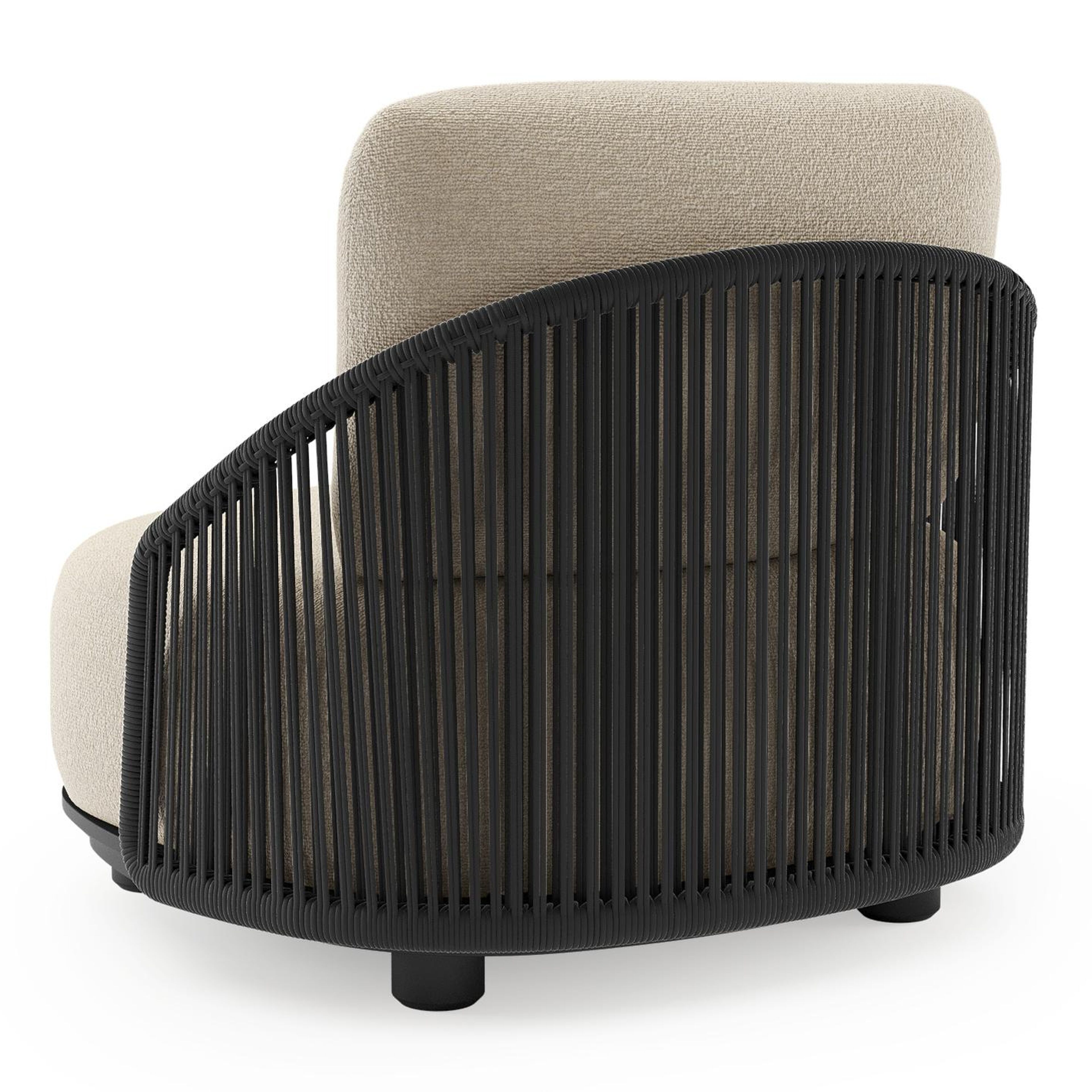 Vadelo loungestoel in zwart aluminium en zwart verticaal geweven ronde rope met marbella sand all weather cosytica kussen | Exterioo tuinmeubelen