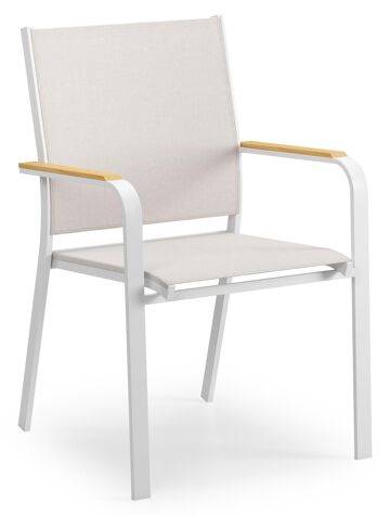 De Amalfi stoel is een stijlvolle stoel met afgeronde armleuningen en heeft een natuurlijke look uit door de armleuningen in teak. De Amalfi stoel heeft een frame uit roestvrij aluminium. De zitting en rugleuning zijn gemaakt uit stevige textilene, een stijlvol en onderhoudsvriendelijk materiaal. Verkrijgbaar in verschillende kleuren. De stoel is stapelbaar en dus makkelijk op te bergen.