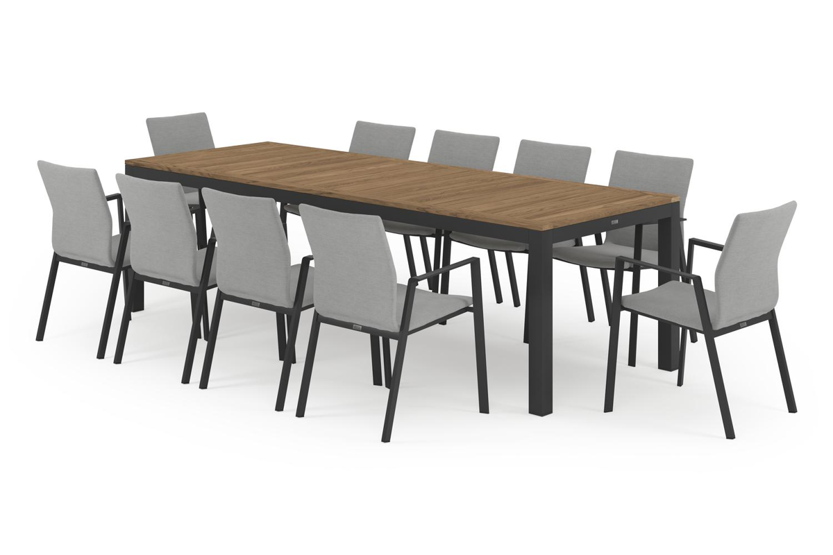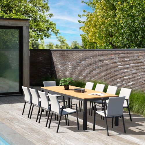 Varese tuinset heeft een minimalistisch design dat perfect past binnen elke omgeving. De tafel heeft een fijne afwerking en een breder tafelblad, waardoor je geniet van een extra zitplek aan de kopse kanten.Het frame van de tafel is gemaakt uit roestvrij aluminium, een sterk, maar toch licht materiaal dat makkelijk verplaatsbaar is. Het oppervlak is glad afgewerkt waardoor het geen vuil aantrekt en onderhoudsvriendelijk is. De poedercoating zorgt voor de UV- en weerbestendigheid van je meubel.Een tafelblad uit teak staat gelijk aan bijzondere kwaliteit en natuurlijk design. Teak is een kwalitatieve houtsoort gekenmerkt door zijn hardheid. Aangezien hout leeft, kan de structuur of kleur licht anders zijn dan op het beeld weergegeven.De Madura stoel is een stijlvol afgewerkte stoel met een rugleuning en zitting die volledig bekleed is met stof. De stof is een stevige textilene, een stijlvol en onderhoudsvriendelijk materiaal. Het frame van de stoel is gemaakt uit roestvrij aluminium. De stoel is stapelbaar en dus gemakkelijk op te bergen.Ervaar onvergetelijke buitenmomenten met de kwalitatieve Varese tuinset.