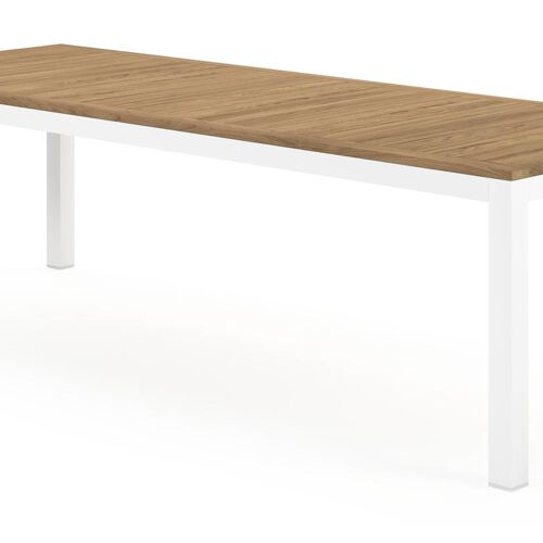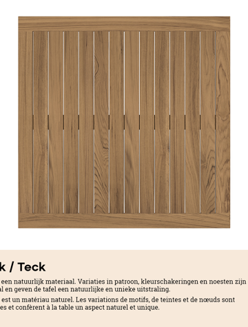 Een tafelblad uit teak staat gelijk aan bijzondere kwaliteit en natuurlijk design. Teak is een kwalitatieve houtsoort gekenmerkt door zijn hardheid. Aangezien hout leeft, kan de structuur of kleur licht anders zijn dan op het beeld weergegeven.