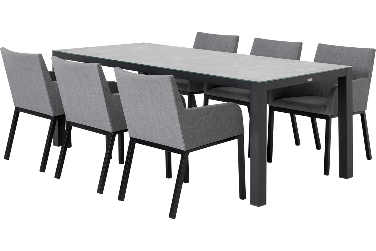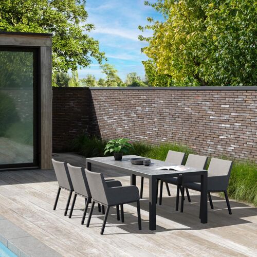 Varese tuinset in zwart aluminium en grijs keramisch glas tafelblad met 6 Rivo tuinstoelen | Exterioo