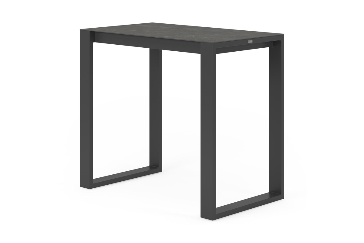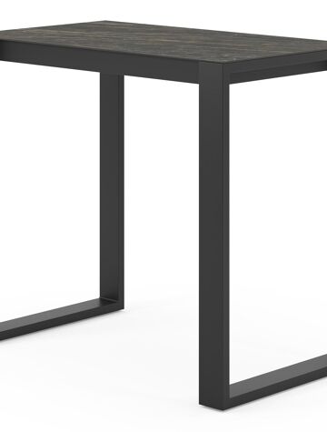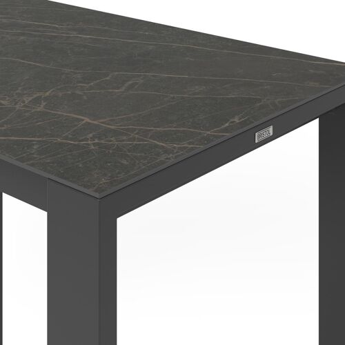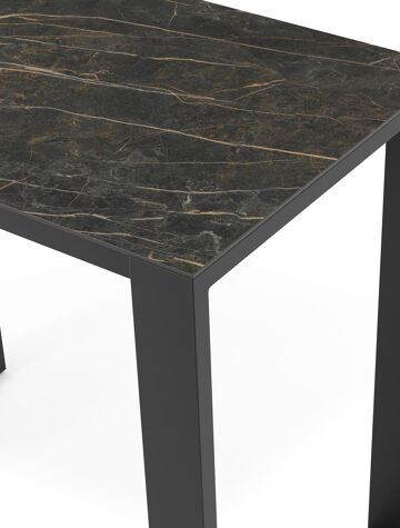 Klaar voor een gezellig apero moment in de tuin? Met de Verato bartafel doe je dit in stijl. De Verato bartafel heeft een strak, U-vormig onderstel. Het frame is gemaakt van aluminium een licht, maar sterk en roestvrij materiaal dat zeer geschikt is voor tuinmeubelen. Deze tafel is afgewerkt met een Black Obsession tafelblad. Een echte eyecatcher voor wie het graag iets luxueuzer heeft. De ondergrond van het blad is zwart maar is afgewerkt met een goudgele aders die een prachtige marmerlook creëren. Het voordeel van volkeramische tafelbladen is dat ze krasbestendig zijn en bestand zijn tegen alle weersomstandigheden.