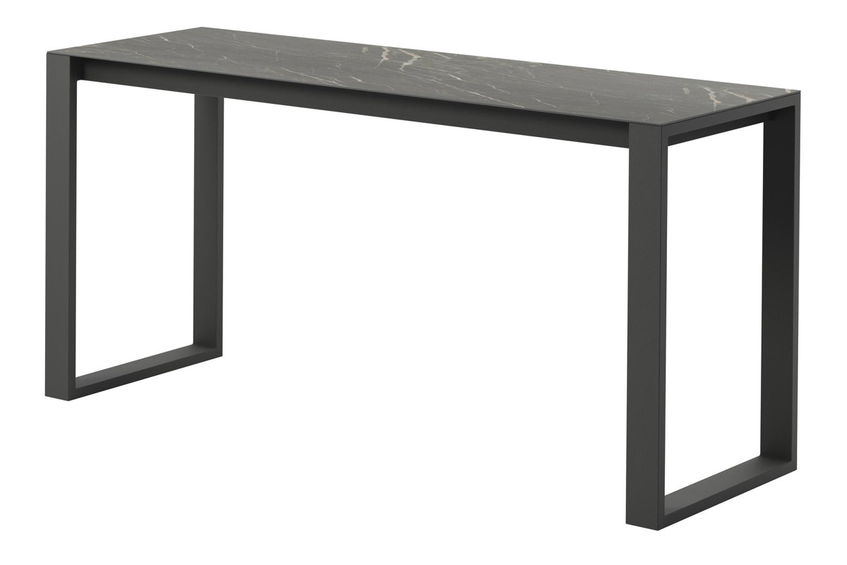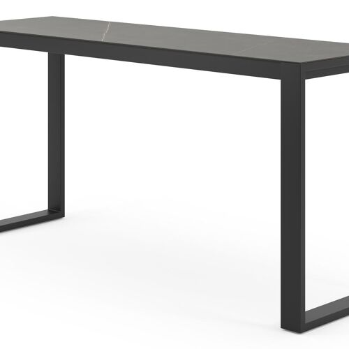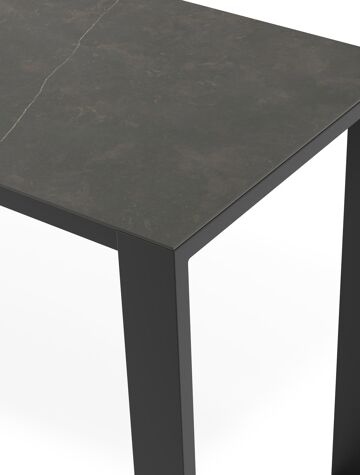 Klaar voor een gezellig apero moment in de tuin? Met de Verato bartafel doe je dit in stijl. De Verato bartafel heeft een strak, U-vormig onderstel. Het frame is gemaakt van aluminium een licht, maar sterk en roestvrij materiaal dat zeer geschikt is voor tuinmeubelen. Deze tafel is afgewerkt met een Calatorao tafelblad. Die is geïnspireerd op een grijze kalksteen. Het blad heeft rustige marmerlook dankzij de gouden aders op de donkergrijze kleurschakeringen. Het voordeel van volkeramische tafelbladen is dat ze krasbestendig zijn en bestand zijn tegen alle weersomstandigheden.