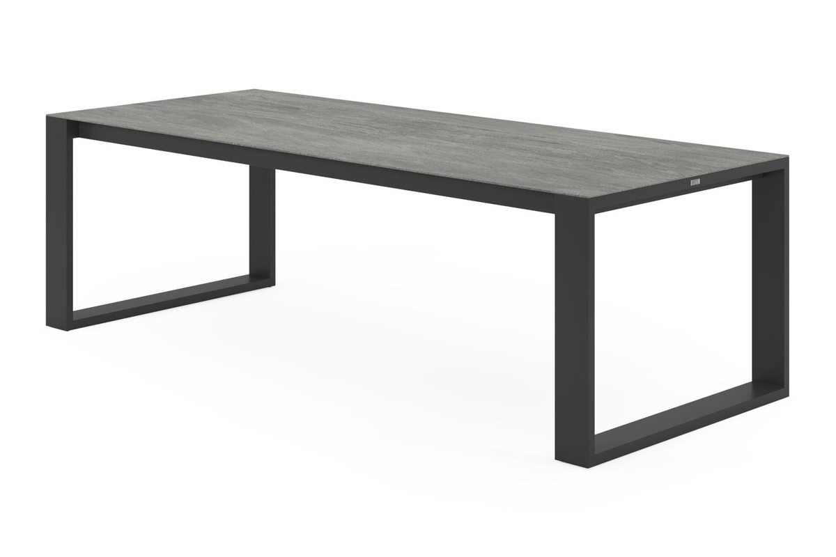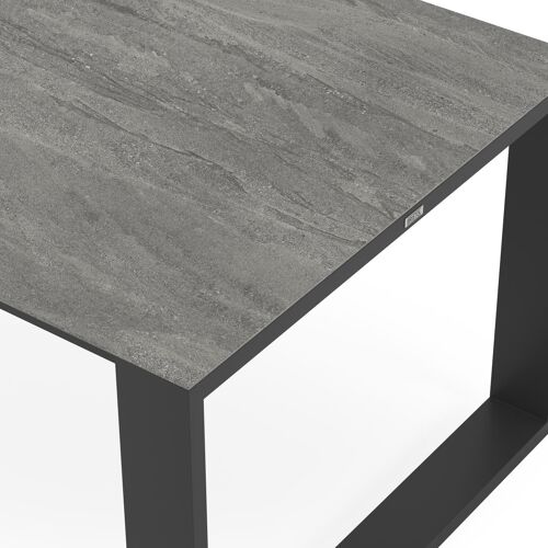 De Verato tafel heeft een strak, U-vormig onderstel. Het frame is gemaakt van aluminium een licht, maar sterk en roestvrij materiaal dat zeer geschikt is voor tuinmeubelen. Deze tafel is afgewerkt met een Aspen Grey tafelblad. Het Aspen grey tafelblad is een mat tafelblad met grijszwarte kleurschakeringen. Het voordeel van volkeramische tafelbladen is dat ze krasbestendig zijn en bestand zijn tegen alle weersomstandigheden.